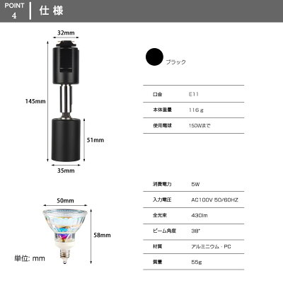 仕様 【器具仕様】 ・品名:ライティングレール用スポットライトE11 ・型番:GT-GD-E11 (ホワイトGT-GD-E11/ブラックGT-GD-E11B) ・適用電球:150Wまで 口金E11 ・本体寸法(mm):約W35×H145×D51 ・本体重量(g):116 【電球仕様】 ・消費電力5W・型番:GT-SP-5-E11-2・50W形 ・消費電力6W・型番:GT-SP-6-E11・60W形 ・口金:E11 ・色温度:電球色/昼光色 ・演色性:≧Ra80 ・全光束:【5W】430lm / 【6W】600lm ・材質:【5W】..;アルミニウム合金 、耐熱ガラス/【6W】...アルミニウム・PC 注意事項 取付け・取外しは必ず電源を切った状態で行なってください。