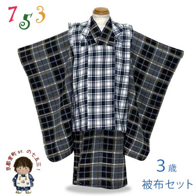 七五三 着物 3歳 男の子 珍しいモダン柄 被布コートセット 合繊 着物と被布着のセット「黒灰系、チェック」WBHset145 購入 販売