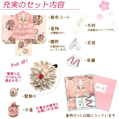 七五三の他に、お正月・桃の節句など、お祝いの行事にワンランク上の被布コートセットはいかがですか? ■商品詳細■ <被布コートセット> ●着物(重ね衿付き) ●長襦袢 ●被布コート ●巾着 ●草履 ●髪飾り ●半衿 ●足袋 身丈: 約 95cm 裄丈: 約 48cm 袖丈: 約 56.5cm 被布コート丈: 約 48cm ・素材 表地 正絹 裏地・じゅばん ポリエステル ・染・生地: 日本製(中国縫製) ・草履 約18cm ・足袋 15cm-16cm ※足袋のサイズ変更をご希望の場合は、採寸と同時に足のサイズをご連絡ください。