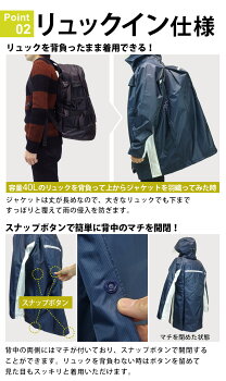 ) 商品説明文 回転フードで左右の確認がしやすい、リュックを背負いながら着用できるヘルメット対応のレインウェアの上下セットです。