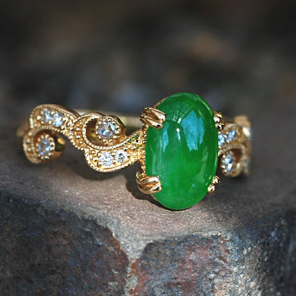 ■スペック [本体仕様]K18イエローゴールド製(サンプル=本体) 翡翠 オーバルカボション (約)9×7mm×1ダイヤモンド (約)1.0mm×8ローズカットダイヤ (約)1.5mm×4 [カラット] 脇石 (約)0.08ct [サイズ] 内径: (約)16.1mm幅: (約)1.4〜9.3mm厚: (約)1.0〜5.4mm [重量] (約)3.26g [対応金種] K18ホワイトゴールド、K18イエローゴールド、K18ピンクゴールド、K18シャンパンゴールド、K18グリーンゴールド※サンプルサイズ:11号