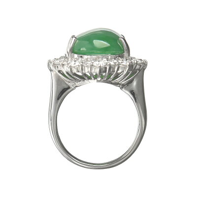 瑞々しく艶やかな質感が美しい大ぶりで厚みのある18ctものヒスイの周りを、トータル1.50ctのラウンドブリリアントカットのダイヤモンドで取り巻いたプラチナ製リング。