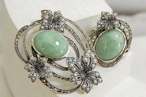 商品データ 材質 翡翠、淡水真珠、マルカジット サイズ モチーフ約27×21mm、アーム幅約13-5mm 貴金属 SV925 古美仕上げ 備考 サイズ直しには約2週間ほどお時間をいただいております。