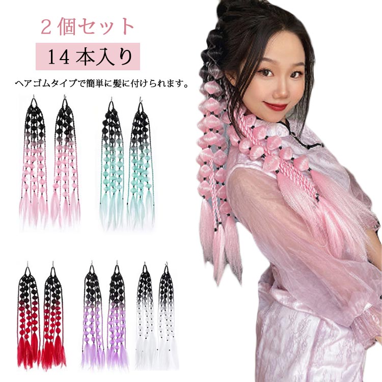 エクステンション 2個セット 14本入り カラフル ダンス 髪型 編み込み グラデーション ブレイズ ポニーテール ドレッド ウィッグ へアゴム レディース ボリューム キッズ 女の子 ヒップホップ ファッション カラフル 毛束 送料無料